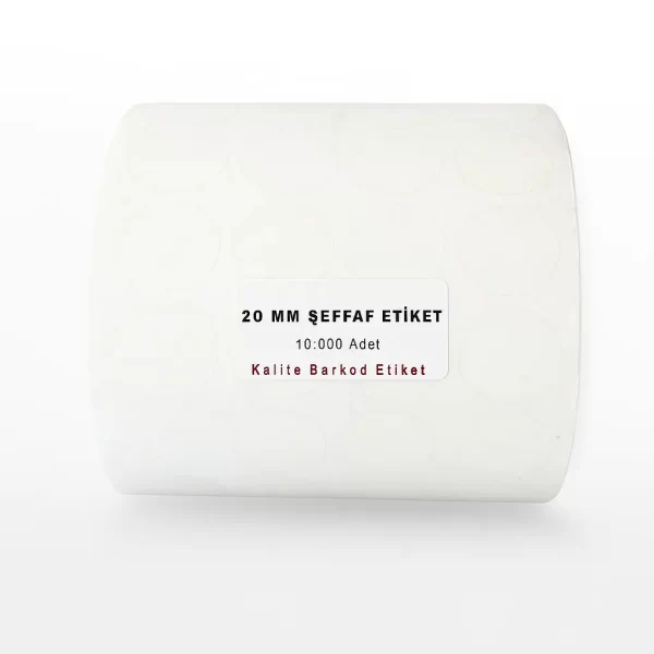 20 mm çapında yuvarlak şeffaf etiket. Bir rulodaki etiket sayısı 10.000 adet dir.